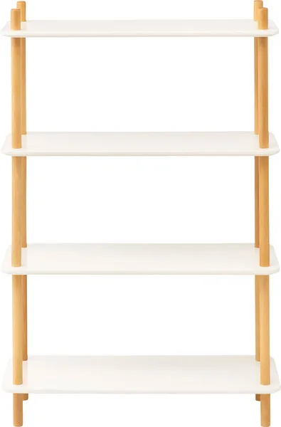 ホワイトの棚と天然木のナチュラルカラーな支柱が優しい印象を与えてくれる、4段ラックです。 使う場所を選ばず様々な場所で活躍してくれるラックは、オープンタイプなので、壁面に設置するだけでなく空間の間仕切りとしても、抜け感を与えながら圧迫感無く使用する事が出来ます。