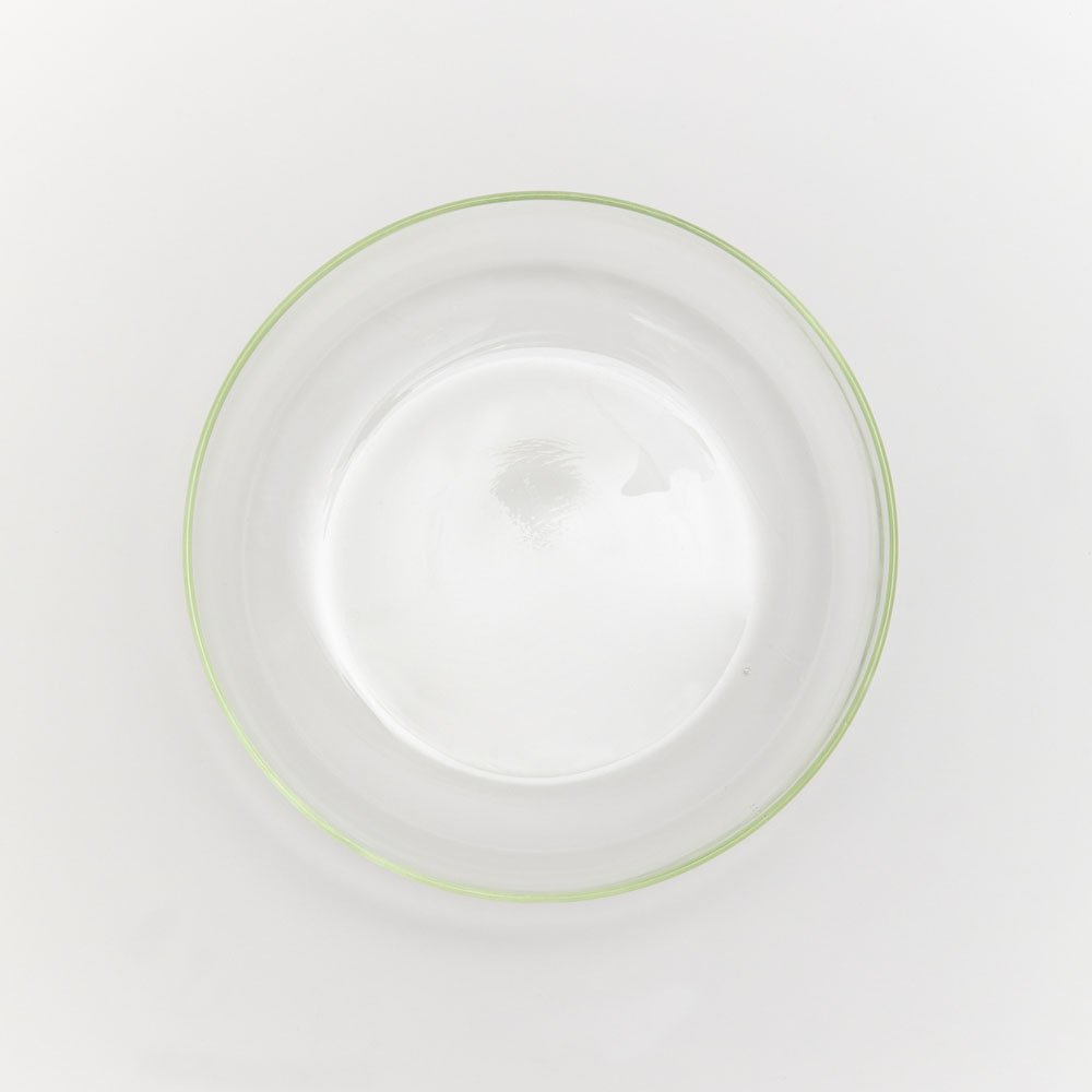 ガラスを吹き終わったあとに断面をカットする「火切り」作業において、厚みがあったり、サイズが大きな商品の場合には焦げ付いたような茶色のラインが出ることがあります。