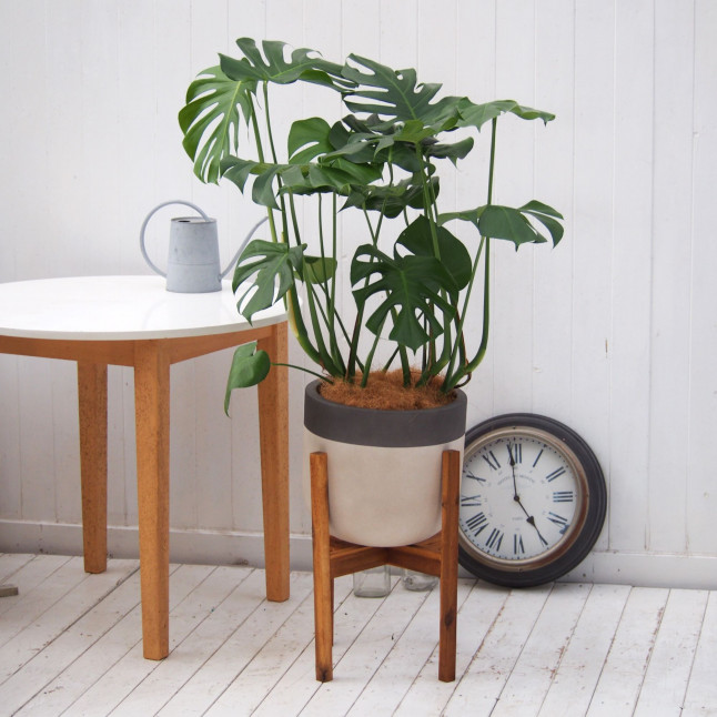 人気の観葉植物をブラックポットとウッドスタンドに合わせました。リビングや玄関など、インテリアにぴったりです。
