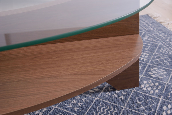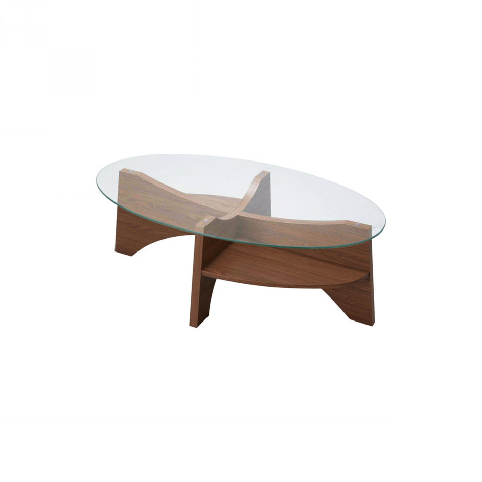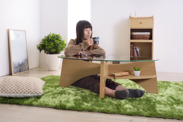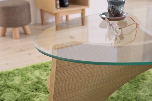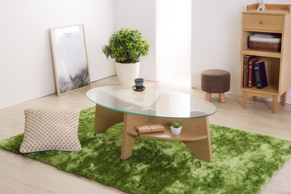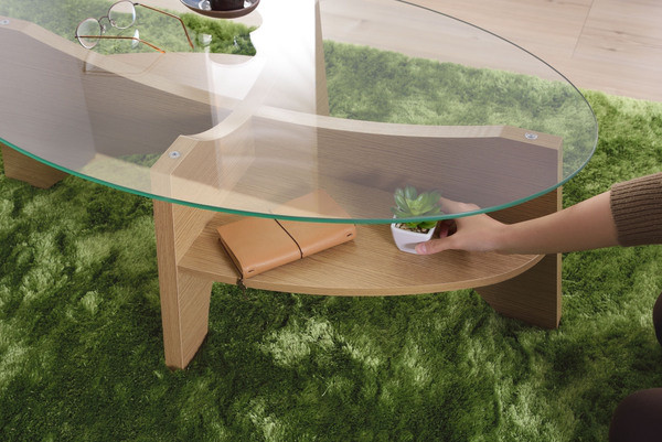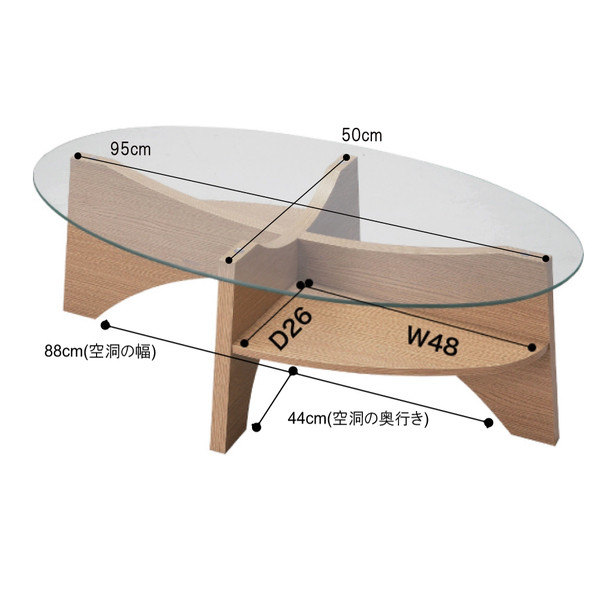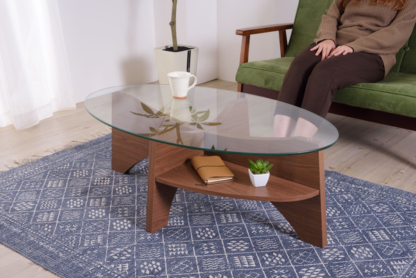 お洒落な楕円形のガラステーブル。 デザイン性のある棚もついてマルチに使えるガラステーブルです。