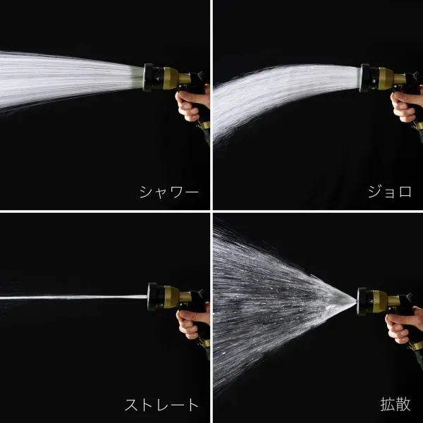 ホースノズルは丈夫な金属タイプで、水の出方は4パターンあり、用途に合わせて切り替えることができます。手元で操作できる水量調整ダイヤルで強弱調整も可能です。鉢植えやデリケートな植物へ水やり、水やりによる土はねを防ぐことが出来ます。